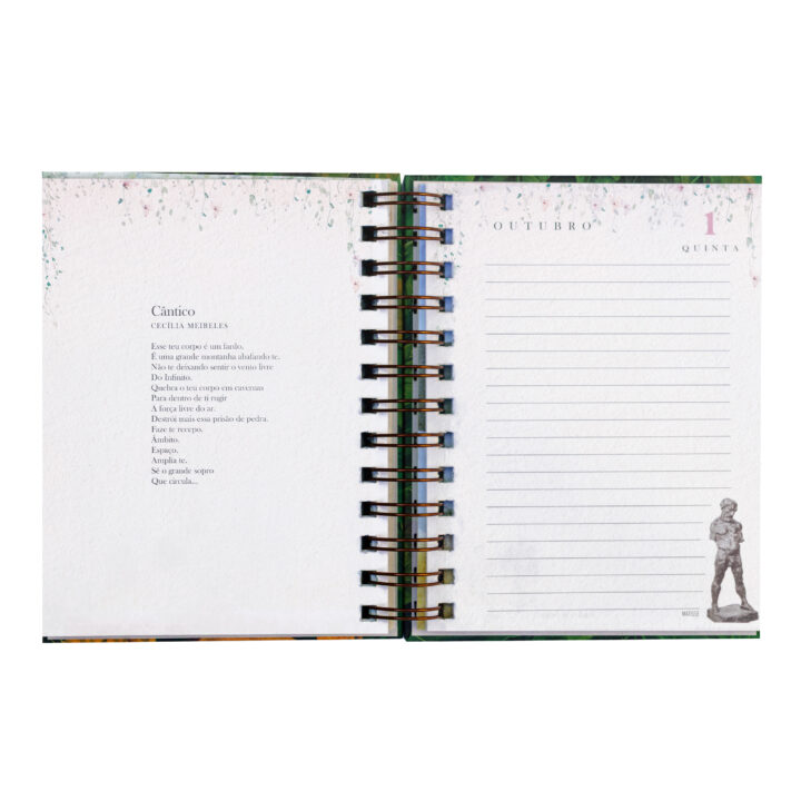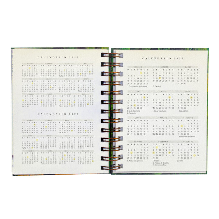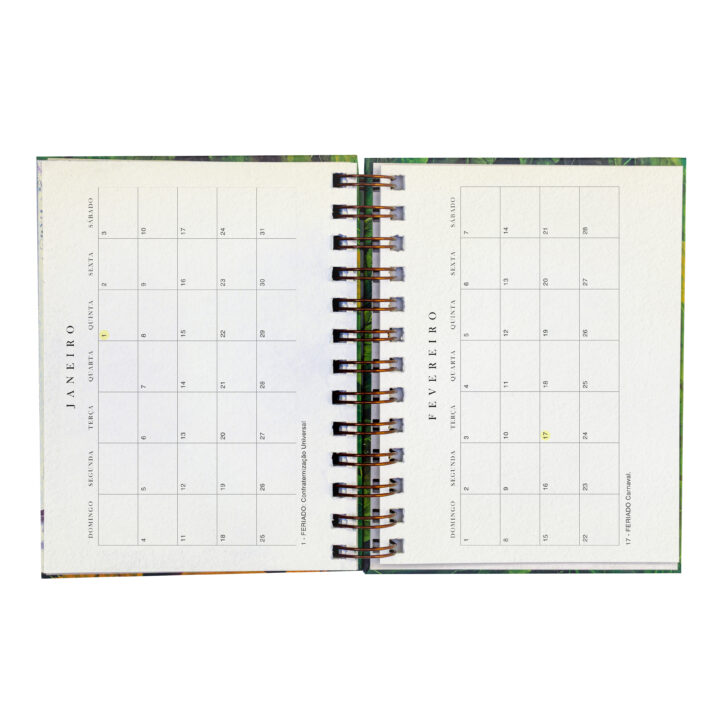 Para o ano de 2026 oferecemos quatro opções de capa: Van Gogh, Frida, Yacunã e Turner. Os fundos das páginas são renovados anualmente e seguem as estações do ano. A parte interna da agenda conta com outras obras de arte e poemas dos mais diversos artistas e, apesar de ser uma agenda diária, possui diversos organizadores como planner mensal além de ter uma linda bolsa de papel dupla.