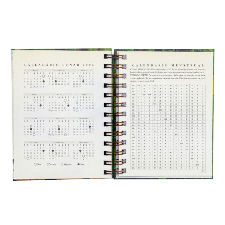 • Contém pequeno compartimento de papel, Planner Menstrual, controle de livros lido, séries e filmes assistidos, Organizador do ano e Calendário lunar e menstrual.